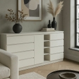 Комод шириною 2000 мм оснащений вісьмома шухлядами (по чотири з кожного боку) та відкритою центральною нішею з полицею. Виріб має спільну суцільну кришку.